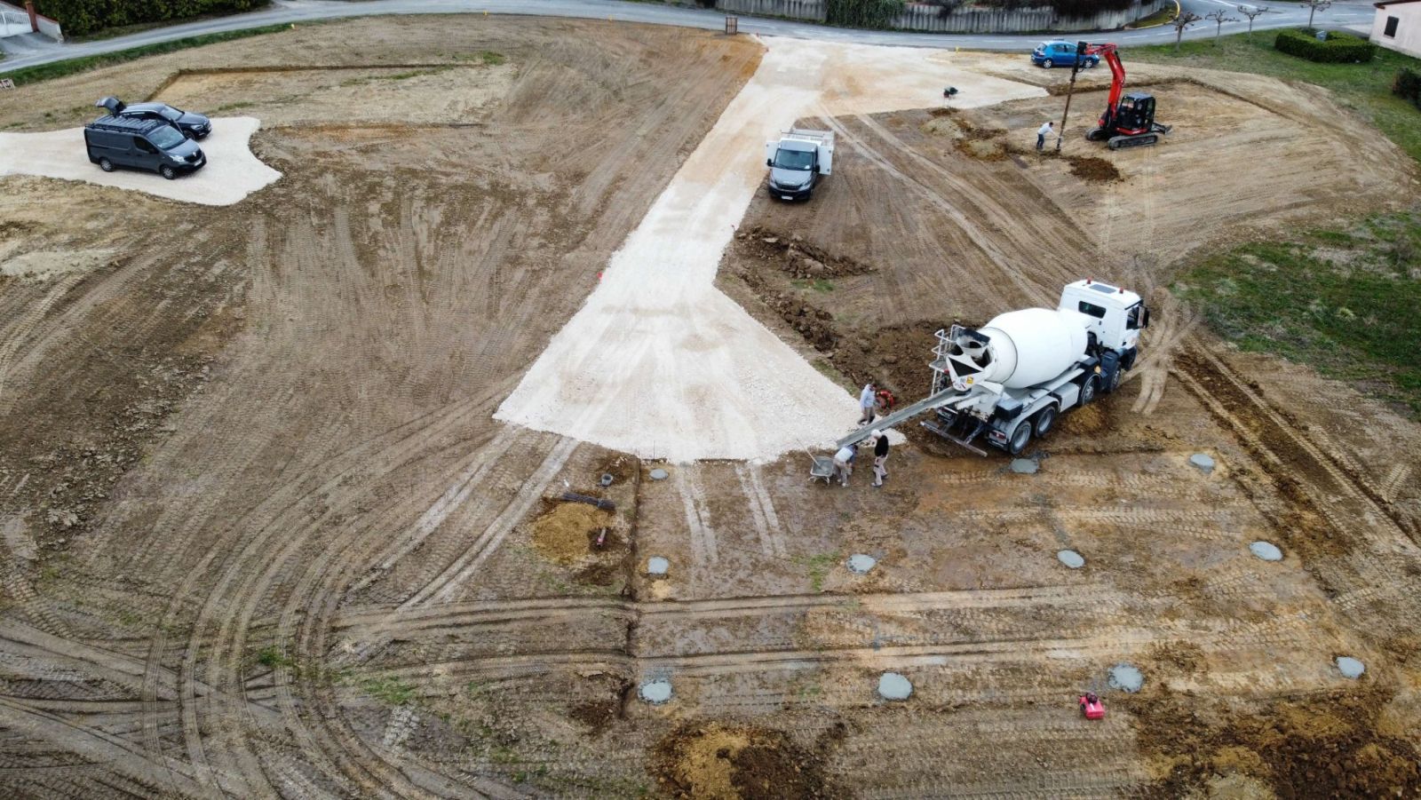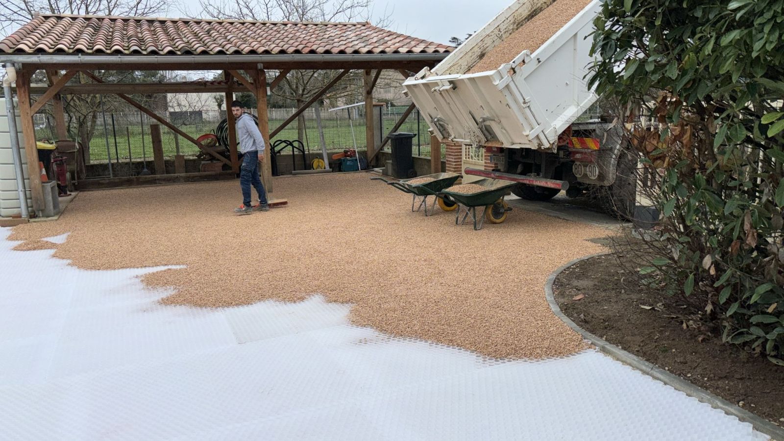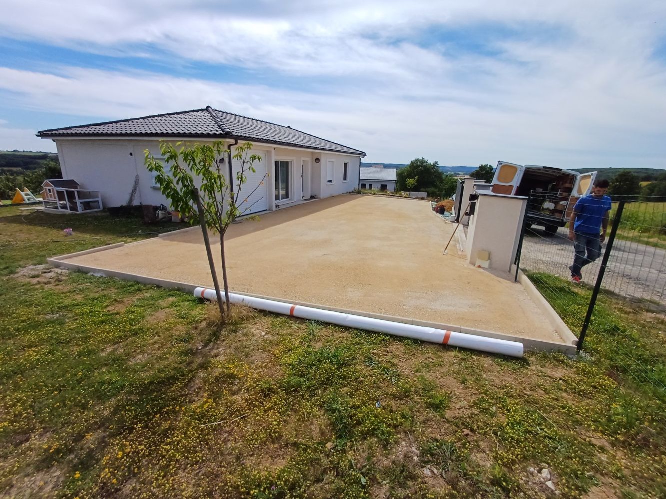 Nos photos et vidéos illustrent des réalisations concrètes : pose de micro-station, nivellement de terrain, goudronnage, location de bennes ou encore création de terrains de pétanque.