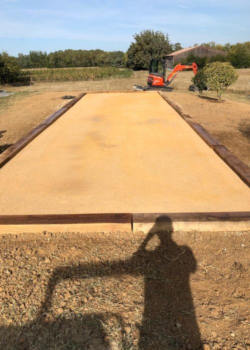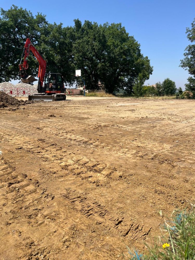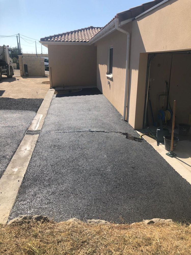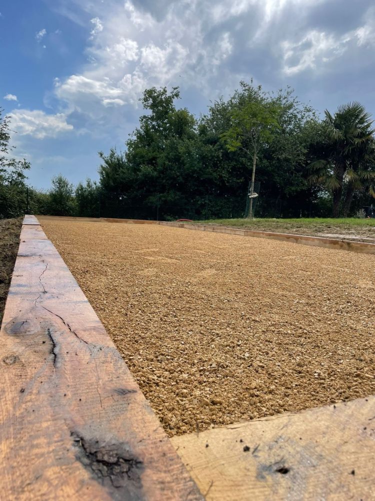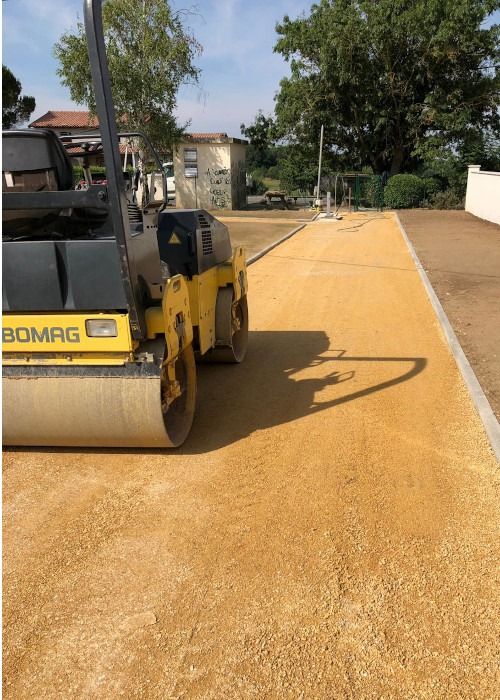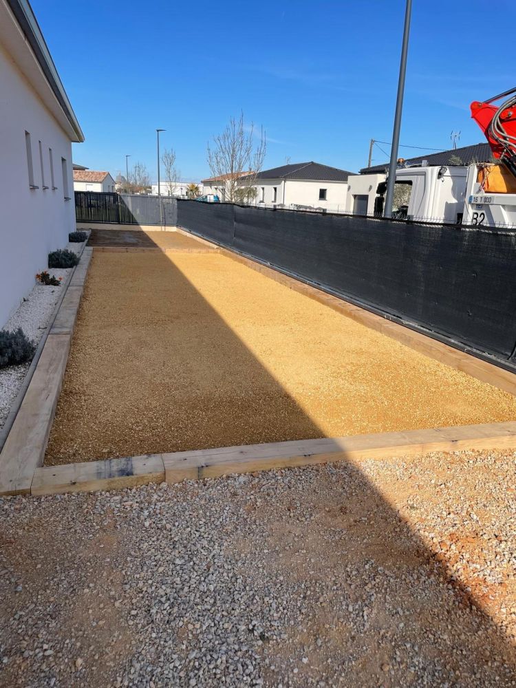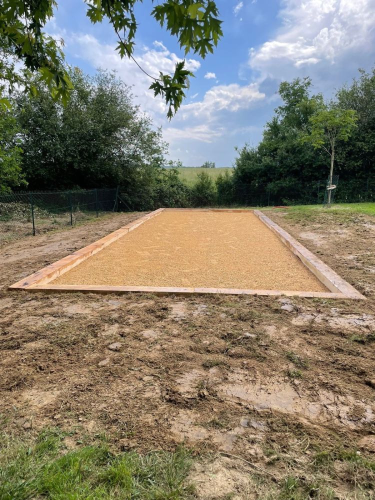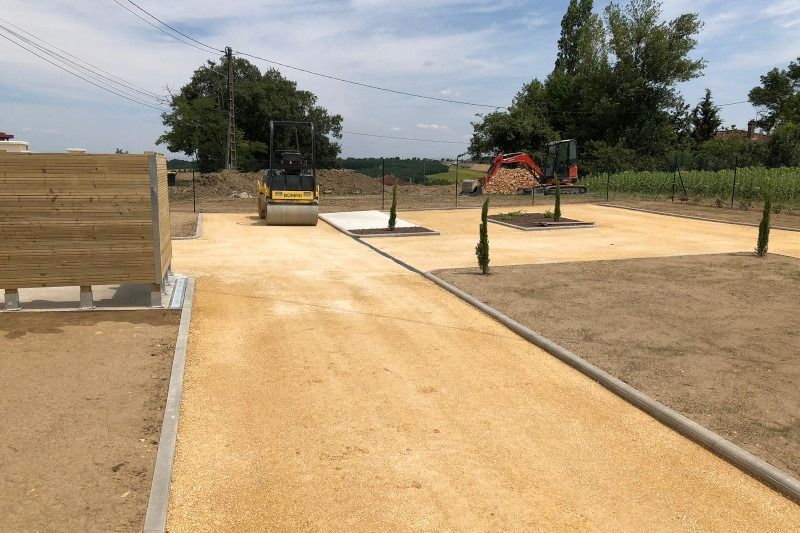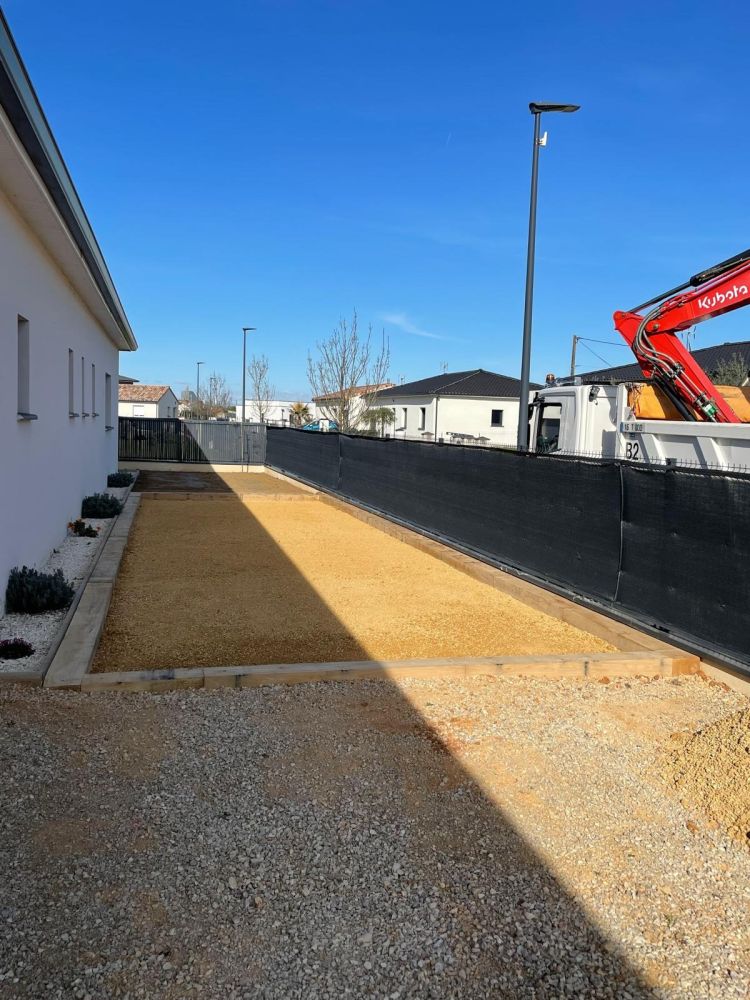Nos photos et vidéos illustrent des réalisations concrètes : pose de micro-station, nivellement de terrain, goudronnage, location de bennes ou encore création de terrains de pétanque.